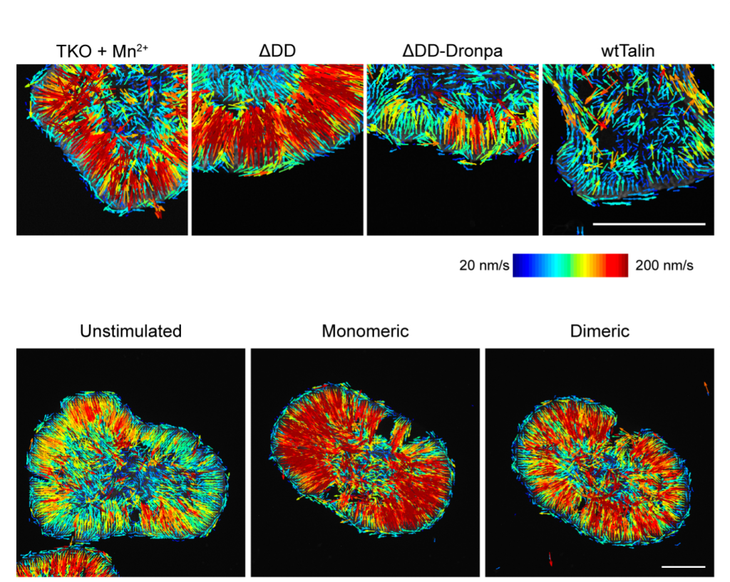 Using cultured fibroblast cells lacking endogenous talin, the researchers showed that light-induced talin dimerization was sufficient to restore key cellular functions. When talin was in the dimeric state, it localized to focal adhesions, promoting cell spreading and polarization, enabling engagement with the actin cytoskeleton. Actin retrograde flow, the backward movement of actin filaments that reflects how well forces are transmitted, also slowed down significantly when talin was dimerized, consistent with effective mechanical coupling.
